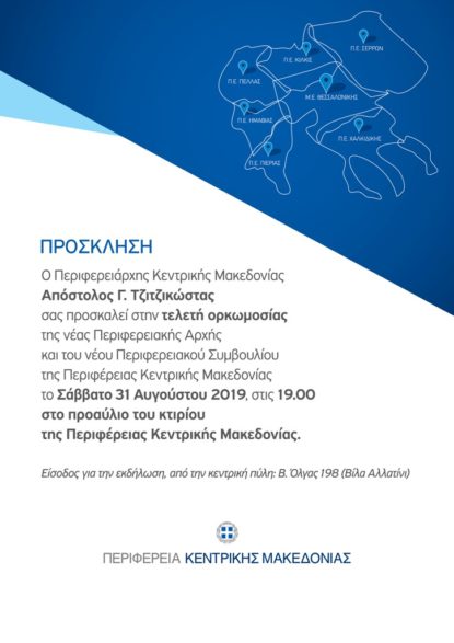 Αύριο Σάββατο 31 Αυγούστου 2019 θα πραγματοποιηθεί η τελετή ορκωμοσίας του Περιφερειάρχη και του νέου Περιφερειακού Συμβουλίου της Περιφέρειας Κεντρικής Μακεδονίας.
