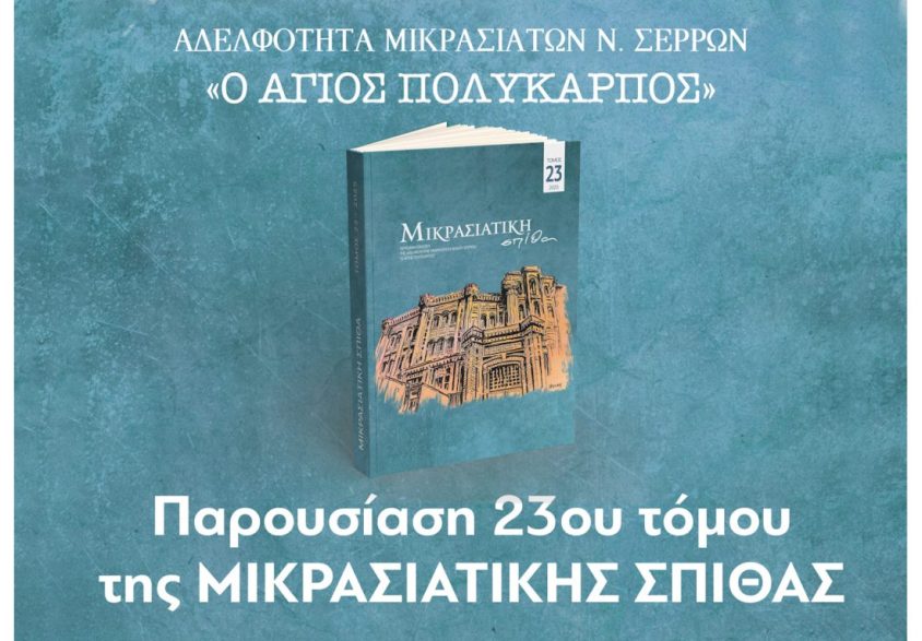 Το Διοικητικό Συμβούλιο της Αδελφότητας Μικρασιατών Ν.Σερρών «Ο Άγιος Πολύκαρπος» και η Περιφέρεια Κεντρικής Μακεδονίας- Περιφερειακή Ενότητα Σερρών, συνδιοργανώνουν και σας προσκαλούν στην παρουσίαση του 23ου τόμου της «ΜΙΚΡΑΣΙΑΤΙΚΗΣ ΣΠΙΘΑΣ» ,του πονήματος της Αδελφότητας Μικρασιατών Ν. Σερρών «Ο Άγιος Πολύκαρπος», που θα πραγματοποιηθεί το Σάββατο 14 Ιουνίου 2025,στις 8:00μ.μ.στον αύλειο χώρο του Διοικητηρίου της Περιφερειακής Ενότητας Σερρών.