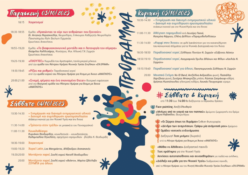 Ο ΣΟΦΨΥ Ν. Σερρών (Σύλλογος Οικογενειών/Φροντιστών και Φίλων για την Ψυχική Υγεία) διοργανώνει και φέτος, στο πλαίσιο του εορτασμού της Παγκόσμιας Ημέρας Ψυχικής Υγείας (10 Οκτωβρίου) και της Παγκόσμιας Ημέρας για την Άνοια (21 Σεπτεμβρίου), ένα τριήμερο γεμάτο δράσεις με αποκορύφωμα το 17ο Φεστιβάλ για την Ψυχική Υγεία και την Άνοια.
