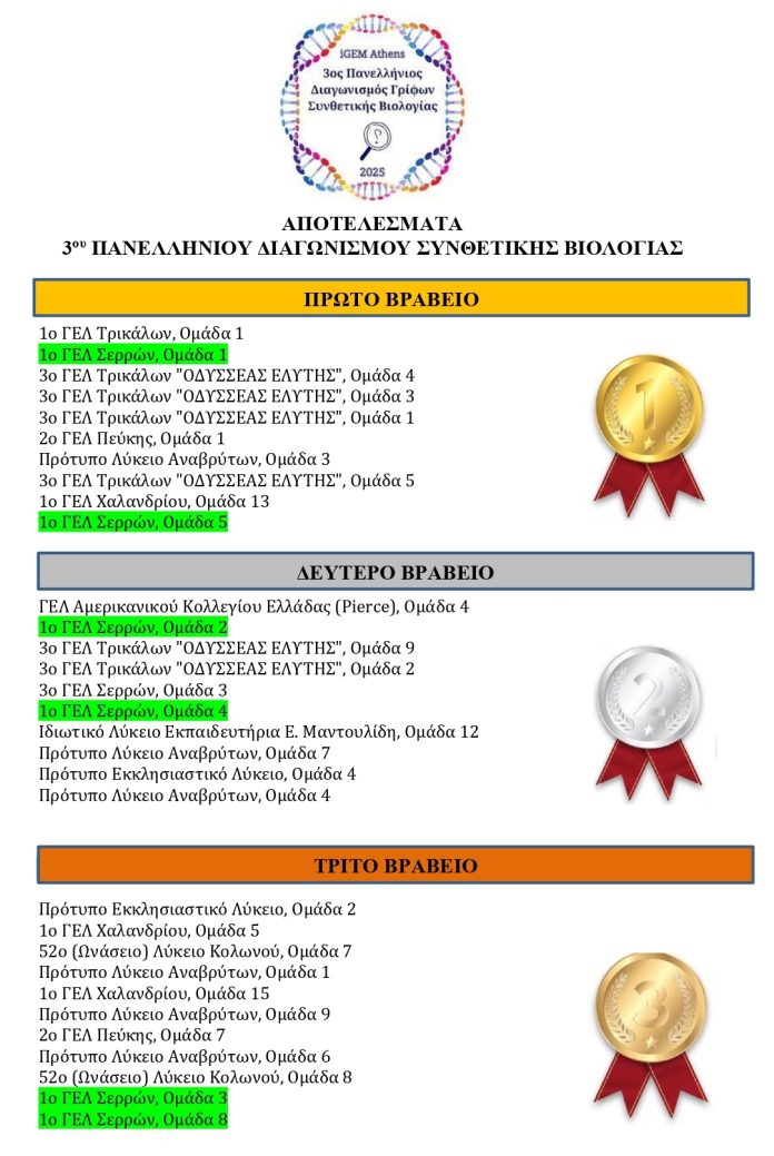 Το 1ο ΓΕΛ Σερρών Θριαμβεύει στη Συνθετική Βιολογία, με 6 Πανελλήνια Βραβεία!