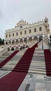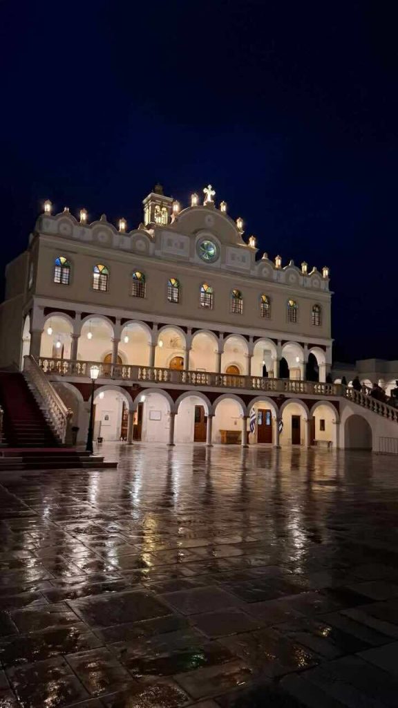 Πρώτος σταθμός ήταν ο Ναός της Μεγαλόχαρης. Τους προσκυνητές υποδέχθηκαν εγκάρδια ο Πρωτοπρεσβύτερος π. Γεώργιος Φανερός, Γενικός Αρχιερατικός Επίτροπος Τήνου, κληρικοί της Ιεράς Νήσου και μέλη της Διοικούσας Επιτροπής του Ιερού Ιδρύματος Ευαγγελίστριας.
