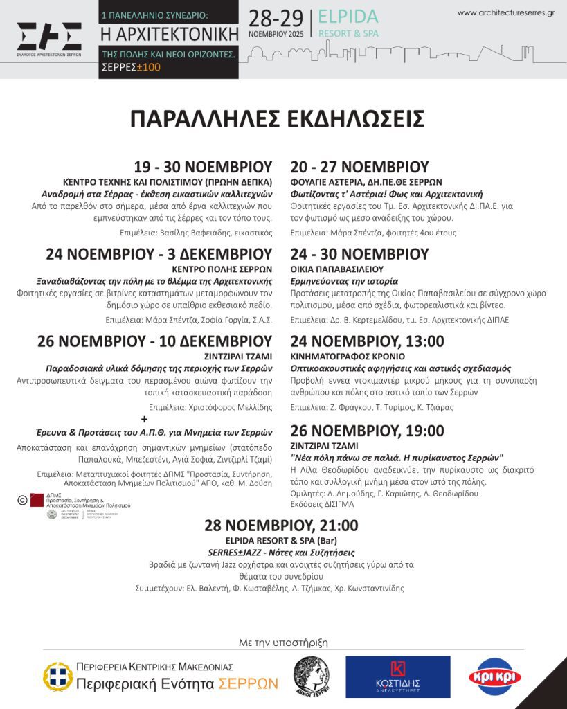 Ο Σύλλογος Αρχιτεκτόνων Σερρών ενημερώνει το κοινό ότι, στο πλαίσιο του 1ου Πανελλήνιου Συνεδρίου μας (28-29 Νοεμβρίου), ανοίγει ένα εκτεταμένο πρόγραμμα παράλληλων εκδηλώσεων που απλώνεται σε όλο το κέντρο και σε σημαντικούς πολιτιστικούς χώρους της πόλης. Με αφορμή τη συμπλήρωση εκατό ετών από την ολοκλήρωση του σύγχρονου πολεοδομικού σχεδίου των Σερρών, η πόλη γίνεται ένα πεδίο ανοιχτού διαλόγου πάνω στην ταυτότητα, τη μνήμη και το μέλλον της.